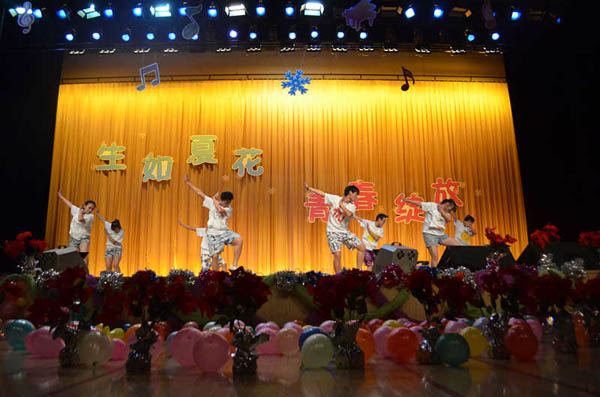 晚会以热情奔放的啦啦操《舞动青春》作为开场,彰显了晚会青春奔放的主旋律。由学生自导自演的小品《大腕云集》,舞蹈串烧《Step up》,舞蹈《白月光》、《小苹果》、《落花情》、《Dance with you》,《imagine》、乐队《歌曲串烧》等节目精彩纷呈、特色鲜明,通过歌曲、小品、乐器演奏、舞蹈等不同形式的表演为大家带来了一场美轮美奂的视听盛宴,无一不展示了学院学生的青春活力和如火激情。尤其是来自学校老教师艺术团表演的二胡齐奏《战马奔腾》、小合唱《大中国》、豫剧《咱俩说说心里话》、葫芦丝笛子重复奏《傣家欢歌》、板胡独奏《秦腔牌孑曲》及宁夏座唱《白字经》等节目,让新生既领略到了中国传统文化的博大精深,也让同学们感受到了老教师们深厚的艺术功底以及对青年大学生健康成长的殷切期望。整台晚会体现了传统与现代完美结合,使“新老携手共谱华章”得到完美诠释。