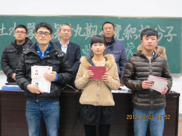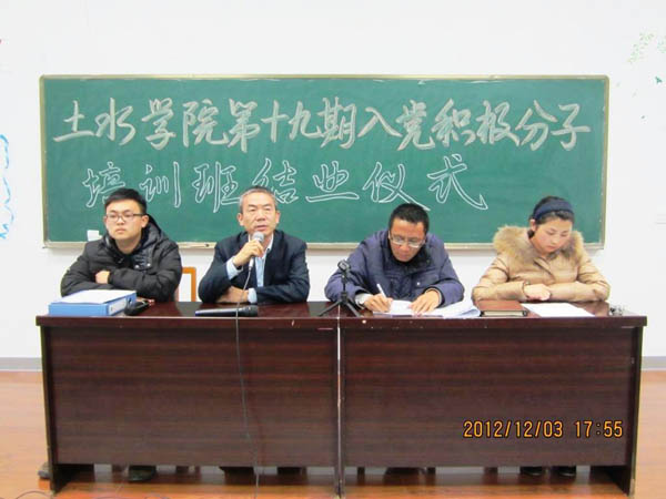 12月3日下午,土水学院第十九期入党积极分子培训班结业仪式在工科楼三阶教室隆重举行。党总支副书记王德全老师、张强老师、12级辅导员马娇老师和151名入党积极分子学员出席了结业仪式。仪式由辅导员王锋峰老师主持。