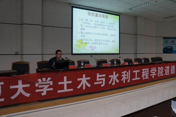 B区广场设计并获奖,2012年经过层层选拔,获重庆大学直博资格,这是他辛勤努力得到的回报。通过讲述自己的求学经历,引导学生在专业上树立吃苦耐劳、精益求精的优良品质。最后,学院2009级土木工程专业熊楚风同学讲述了自己在大学担任学生干部的经历,他把学生工作当作志愿服务的平台,扎根基层工作,认真履行职责,很好地处理了学习和工作的关系,成为学生和学院有效沟通地桥梁,2012年也获得保研资格,被重庆大学录取。通过自身成长经历的讲述,引导学生树立恪尽职守、敬业奉献的优良品质。
