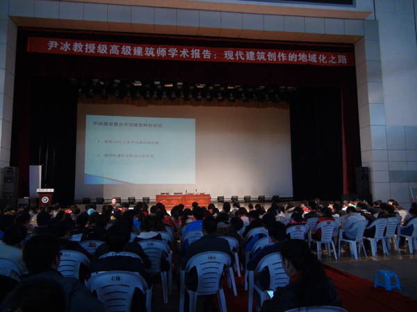 报告中尹冰先生结合自己主持设计的“宁夏银川阅海中央商务区国际会议中心”、“银川工会大厦”、“吴忠图书馆”三个项目案例,从设计理念、地域文化、民俗背景、建设场地、周边环境、功能组成等内容出发,对三个不同功能要求的公共建筑设计进行了详尽的评析、说明。重点从区域环境角度分析了宁夏地区建筑的应有特色,从而提出“尊重自然和地域特点,结合本地文化、技术、材料及民俗特征的建筑才能称为好建筑”、“本土建筑应当反映本土文化”等重要观点。