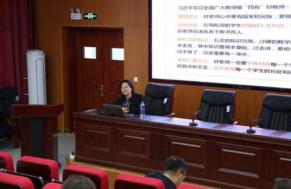 张教授从古今中外对师德师风基本内涵的理解认识,结合对习近平总书记2018年5月2日在北京大学的重要讲话和2018年9月10日在全国教育大会上的重要讲话精神的学习领会,重点阐述了坚持立德树人、强化教师队伍建设的重要性。她详细解读了《教育部关于建立健全高校师德建设长效机制的意见》和《新时代高校教师职业行为十项准则》等师德师风建设相关文件精神,同时对教育部《十项准则》与《宁夏大学师德失范行为处理办法(试行)》进行了对照说明。生动的讲座使与会教职工加深了对师德师风建设重要意义、重点工作的理解,进一步牢记肩负的历史使命和职责,进一步明确师德师风和教师职业道德的底线、红线、高压线。对全面贯彻全国高校思想政治工作会议精神,全面加强学院师德师风建设工作都具有十分重要的指导意义。