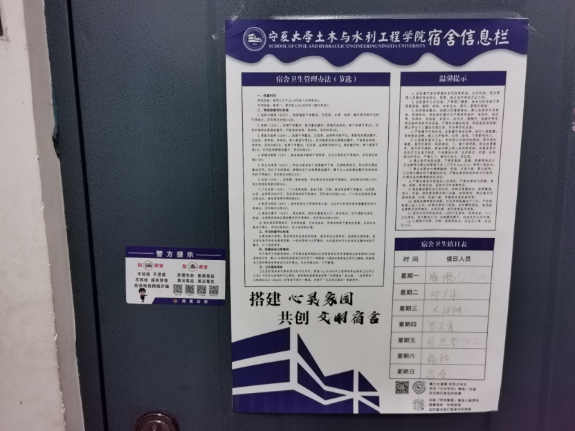 宿舍信息栏由《宿舍管理办法(节选)》、温馨提示和宿舍卫生值日表三个部分组成,充分体现学院加强宿舍管理的决心,同时,也有效解决了各类文件在墙上张贴显得凌乱的问题。宿舍信息栏还将“土水年华”微信和抖音二维码、“学苑管家”小程序二维码展现在外,拉近了同学们与学院和公寓的管理的距离。