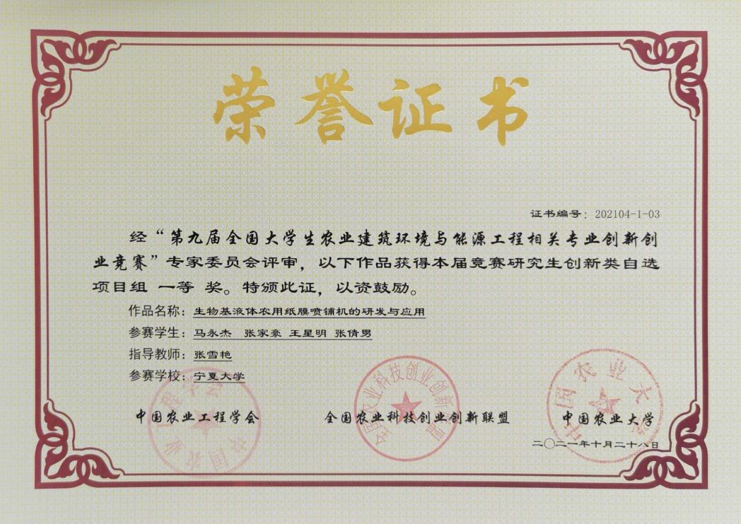 参加决赛,共获得一等奖1项,二等奖2项,三等奖2项。其中由农学院张雪艳教授指导,马永杰等四名同学参赛的研究生创新类自选项目《生物基液体农用纸膜喷铺机的研发与应用》获得一等奖;由快乐8
