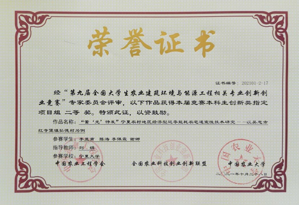 刘娟副教授指导,李昱甫等四位同学参赛的本科生创新类指定项目《“蓄‘光’待发”宁夏农村地区经济型近零能耗农宅适宜性技术研究》获得二等奖;由快乐8