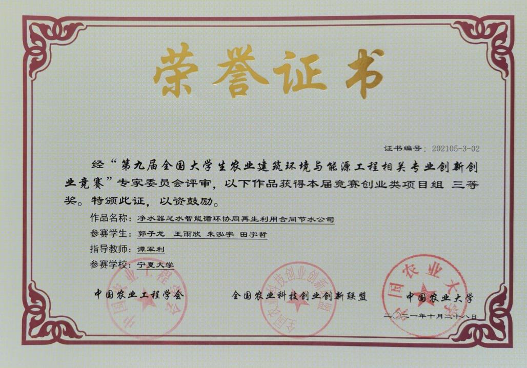 谭军利教授指导,郭子龙等四名同学参赛的创业类项目《净水器尾水智能循环协同再生利用合同节水公司》获得三等奖。我校获评“优秀组织奖”。