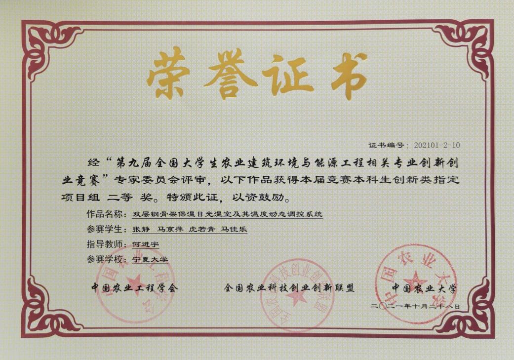何进宇副教授指导,张静等四名同学参赛的本科生创新类指定项目《双层钢骨架保温日光温室及其温度动态调控系统》获二等奖;由快乐8