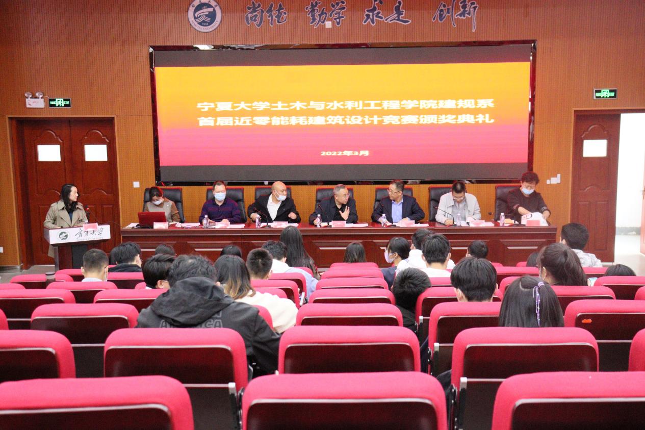 2022年3月30日下午,宁夏大学土木与水利工程学院建筑与城乡规划系在知行楼三楼阶梯教室举行“2021年宁夏大学土木与水利工程学院近零能耗建筑设计竞赛”颁奖典礼。宁夏中昊银晨能源技术服务有限公司董事长陈廷敏、副总经理张孝德,土木与水利工程学院党委书记陈晓敏、党委副书记苏宇静、副院长李王成、建筑与城乡规划系主任马冬梅,副主任徐浩出席了本次颁奖典礼。