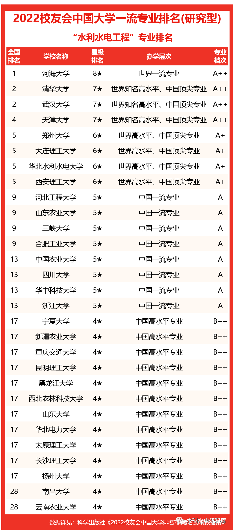 水利水电工程专业荣得四星级专业(4★,B++)。