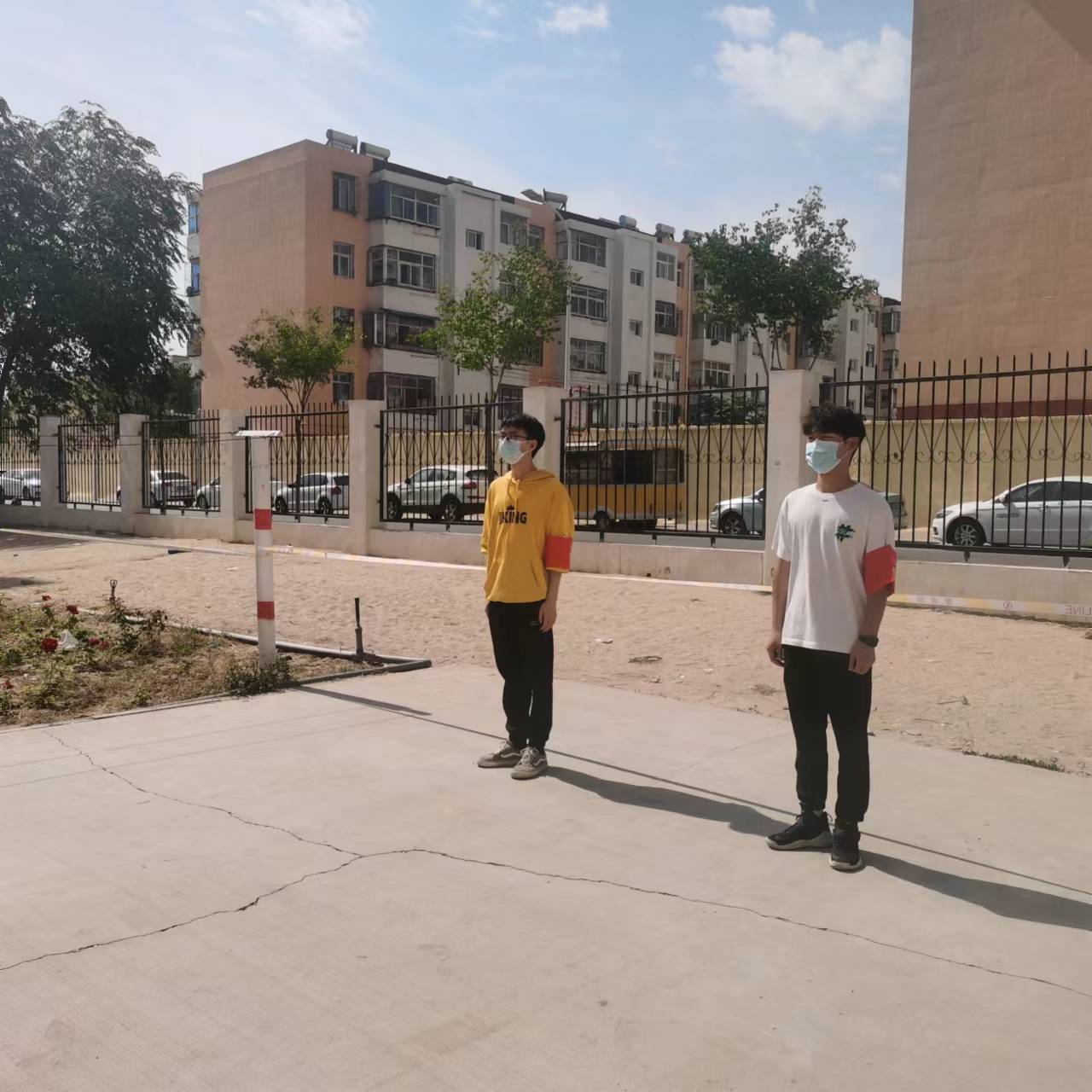 在公寓楼外和围墙边,由党员和积极分子组成的疫情防控志愿者,正在积极巡查有无违规拿取外卖的行为,并耐心做好督促和引导工作,杜绝学生因定外卖而带来感染风险。
