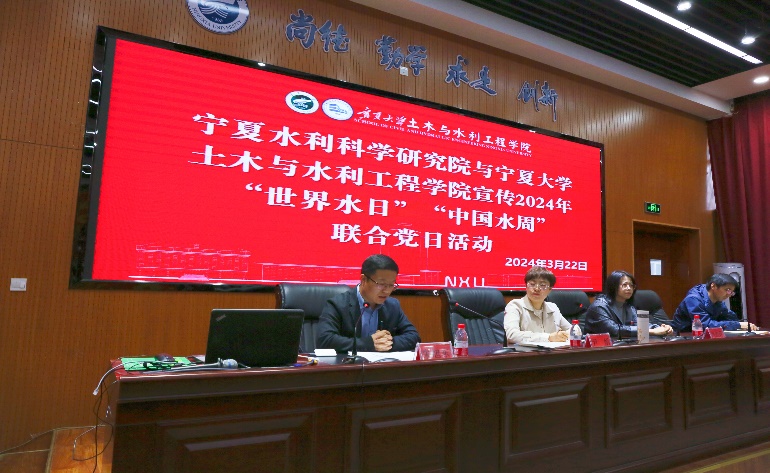 2024年3月22日上午,宁夏大学土木与水利工程学院与宁夏水利科学研究院2024年“世界水日”“中国水周”联合党日活动在宁夏大学文萃校区知行楼三阶报告厅举行。宁夏水利科学研究院朱旭东副院长,周志轩副院长,办公室党支部、科研管理科党支部、灌溉试验中心站党支部、水利工程研究室党支部党员,土木与水利工程学院领导、教师及学生参加了此次活动。