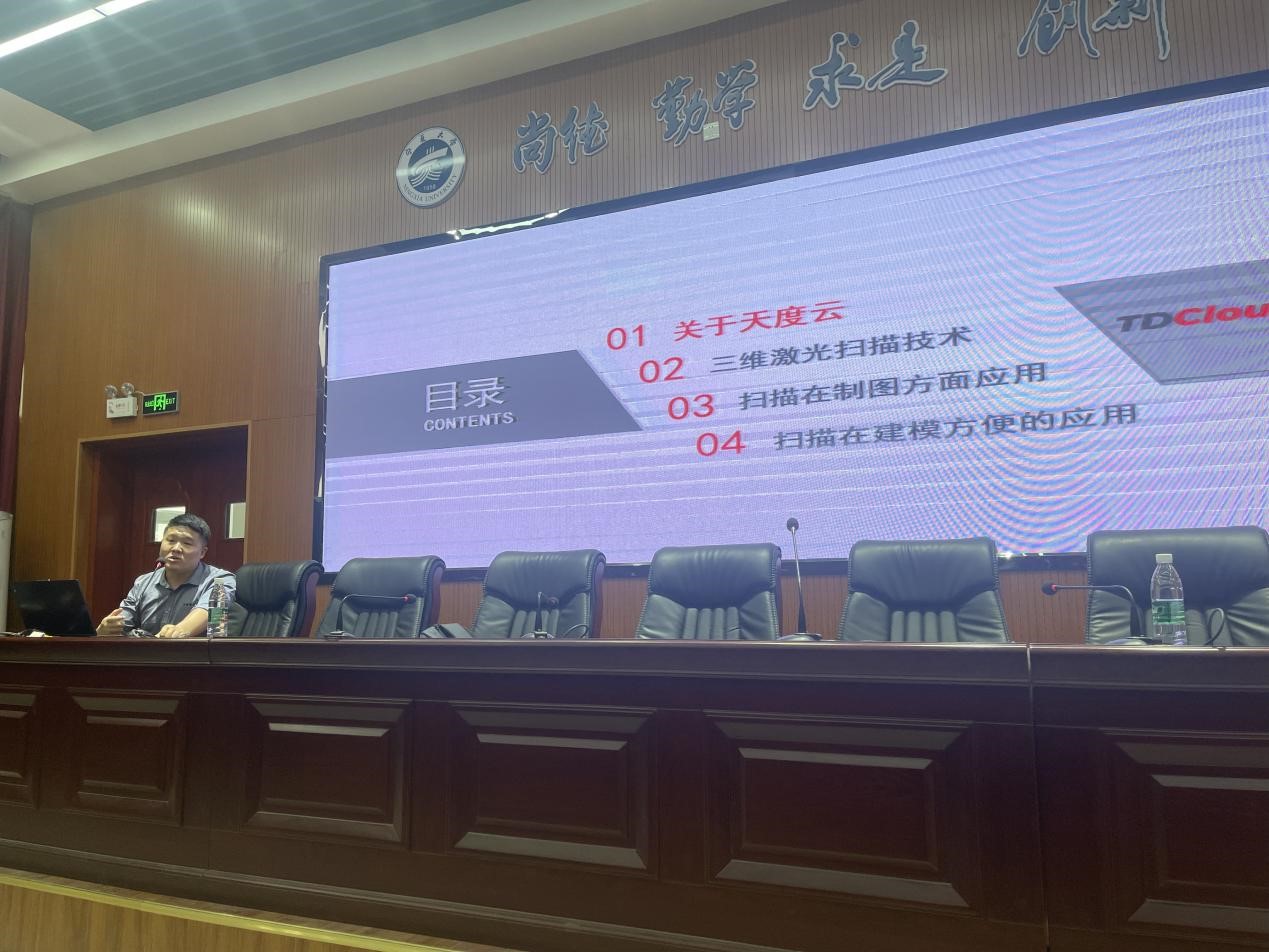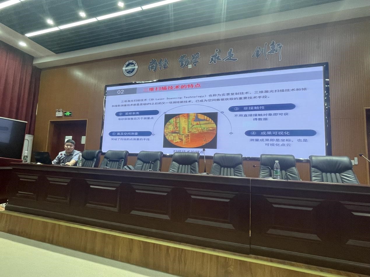 王炳亮老师首先介绍了到访的企业专家,简单介绍了举办本次讲座的初衷和目的。随后,特邀讲师天度智云总经理王俊,结合技术团队在大数据、人工智能、地理遥感信息、扫描测绘等高新科技领域的具体项目案例,系统介绍了数字技术赋能工程建设的历史沿革和应用现状,重点讲述了三维激光扫描技术原理、应用流程以及应用效果,以三维扫描技术构建工程实体高精度模型为例,全面呈现了工程领域新质生产力发展动态和趋势。讲座图文翔实、影音素材丰富生动,开拓了师生视野,激发了学习水利工程高新技术的浓厚兴趣。