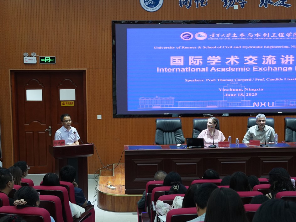2025年6月18日,法国国家科学研究中心环境遥感研究室主任Thomas Corpetti教授与法国雷恩大学Candide Lissak教授应邀到访宁夏大学土木与水利工程学院,围绕水文遥感、智慧水利与环境健康风险评估等主题开展学术交流,分享最新研究成果。Thomas Corpetti教授和Candide Lissak教授分别为学院师生作题为《Urban Air Temperature Estimation with Neural Networks Pretrained on Physical Models》、《Remote Sensing Application in Risk and Health Exposure Assessment》的学术报告。学院党总支书记尹娟、副院长李王成及水利系教师、学生100余人参加。报告会由冯克鹏教授主持。