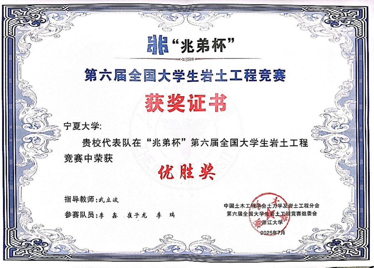 由我校土木与水利工程学院武立波老师指导,李鑫、崔子龙、李瑞三位同学组成的宁夏大学代表队凭借扎实的专业素养和出色的团队协作,在初赛、复赛中脱颖而出,最终斩获大赛优胜奖,实现了我校在该项赛事中奖项零的突破,展现了我校在岩土工程领域的教学水平和学生创新能力。