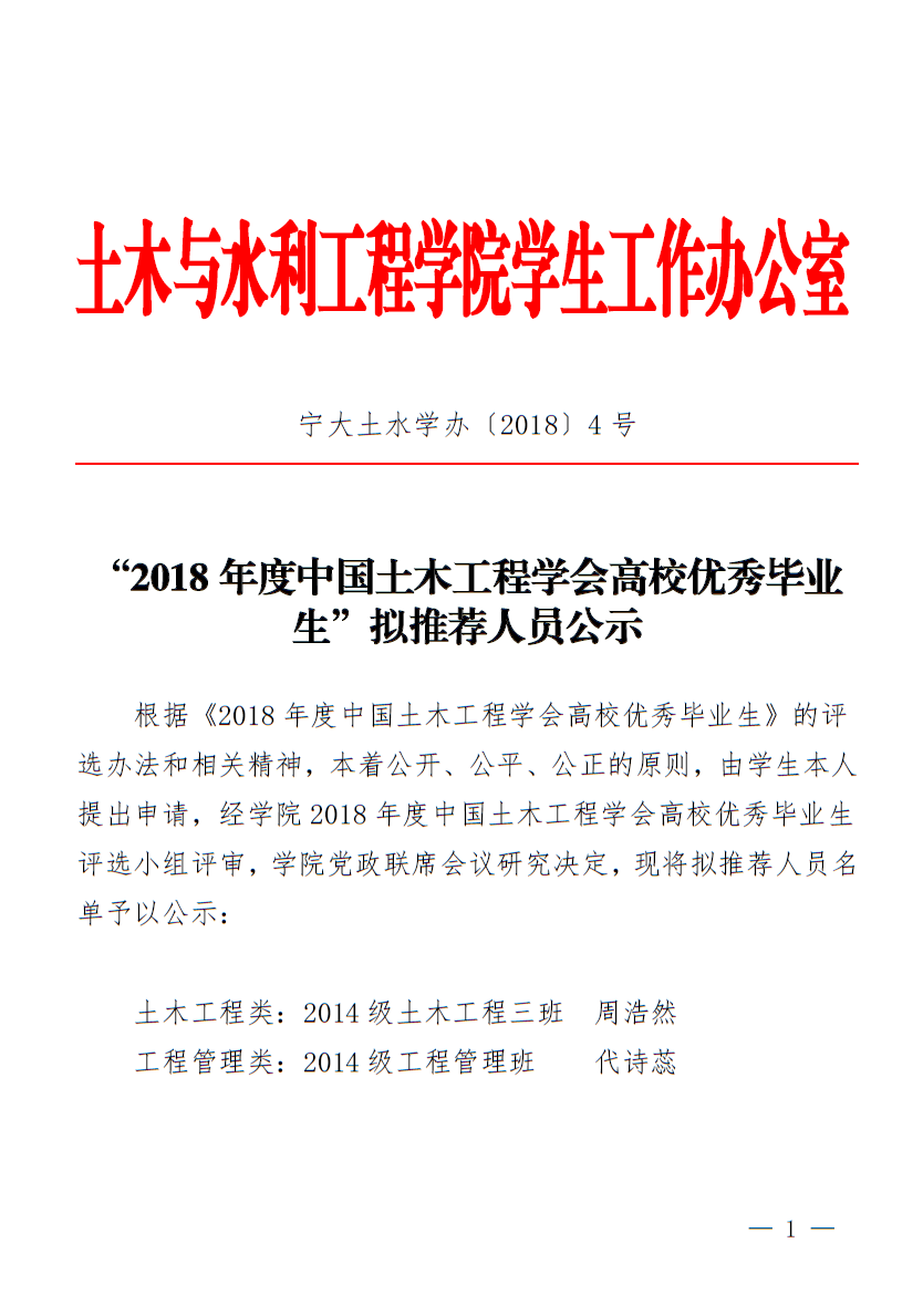 “2018年度中国土木工程学会高校优秀毕业生”拟推荐人员公示