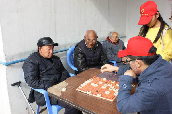 同学们首先热情地问候了每一位老人,老人们也与同学们握手表示对大家到来的欢迎。仔细地看着老人们的面孔,皱纹像一条条小溪清晰可见,微微凹陷的眼窝,一双双深褐色的眼眸,悄悄地诉说着时光的沧桑。通过与老人的对话,同学们了解到他们的生活情况,随后又从工作人员口中得知他们的喜好。很快,一行人分成几个小队,有的蹲下来,陪行动不便坐在椅子上的老奶奶聊天,聊聊最近的身体健康状态,有的陪老爷爷下起了象棋,尽管老人们年事已高,然而在棋局上仍然老当益壮,风采不减当年,一双充满岁月痕迹的手,在棋盘上以别扭的手法挪动着棋子,拨弄局势,与同学们在棋局中厮杀着。在一位老爷爷的提议下,几名同学陪老人打起了家常麻将,在洗牌摸牌的交替中,气氛逐渐升温,还有几位同学陪老人打牌,相处十分和睦。