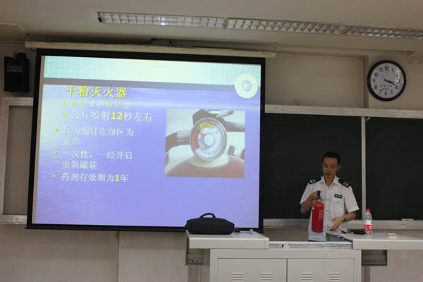 讲座伊始,陈警官以天津港“8·12”瑞海公司危险化学品仓库特别重大火灾爆炸事故为例引出了今天的讲座的主题,点出了消防安全在日常生活中的重要性。然后,陈警官为同学们分析了公安部消防局的统计数据,指出全国每年都有大量的人员死于消防知识的欠缺。他说:“我国消防工作以预防为主,防消结合”,并分析了生活中一些常见的火灾隐患,以及火灾发生的种种原因,即:缺少专业灭火、逃生技巧,缺少自防自救、逃生技能。之后,陈警官为同学们讲解了干粉灭火器、水基灭火器、气溶胶灭火器使用方法以及注意事项,并呼吁同学们:“安全不能等待,生命不能重生,我们必须吸取教训,敲响安全警钟”。