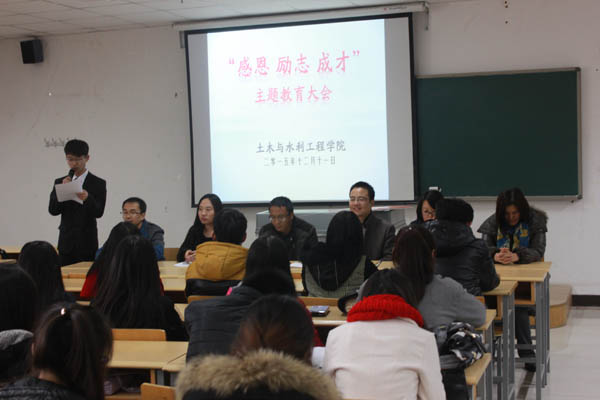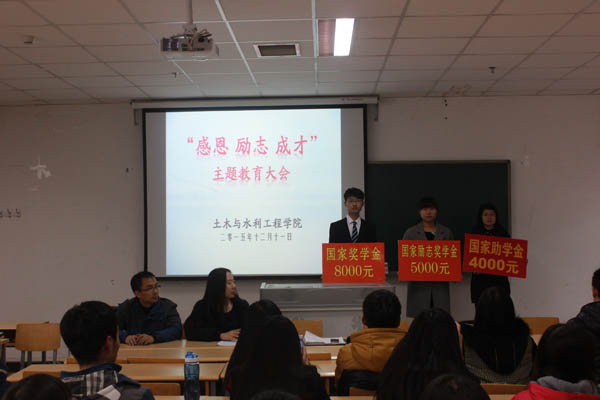 本年度各类奖助学金评定工作进行了简单的回顾。王娜老师宣读2015年国家奖学金、国家励志奖学金、国家助学金获得者名单。之后学生代表2014级周浩然、2013级谭一品、2015级张美洁三名同学分别代表国家奖学金、国家励志奖学金、国家助学金获得者先后做了发言,他们表达了对学校、老师辛勤培养的感谢之情,表示会努力学习回报学校、回报社会、回报国家。最后,张强副书记作了总结讲话,他从今年资助政策的变化、学院资助工作的情况两方面入手,对今年的评定工作进行了系统性的总结,对广大同学提出了要有感恩奉献意识、树立自立自强意识,增强勤俭节约意识三个方面的要求,希望同学们能更加努力学习,争取取得更好的成绩。
