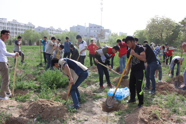 绿化植树活动在C区15号公寓楼前进行。参与本次植树活动的有学院党委副书记张强老师、学办主任郭利老师、团委书记王娜老师和兼职辅导员韩东,学院2014级全体男生、青马班和发展对象培训班学员共300余名同学参加。
