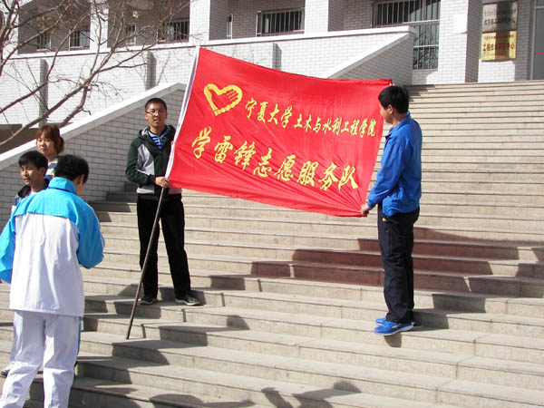 学雷锋志愿者服务队”在工科楼下集合,进行学雷锋志愿服务活动。