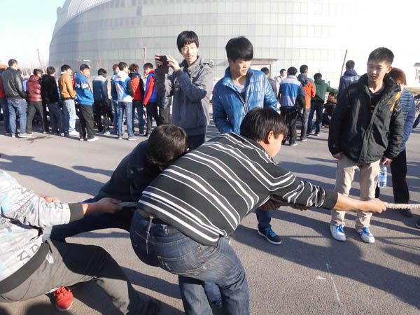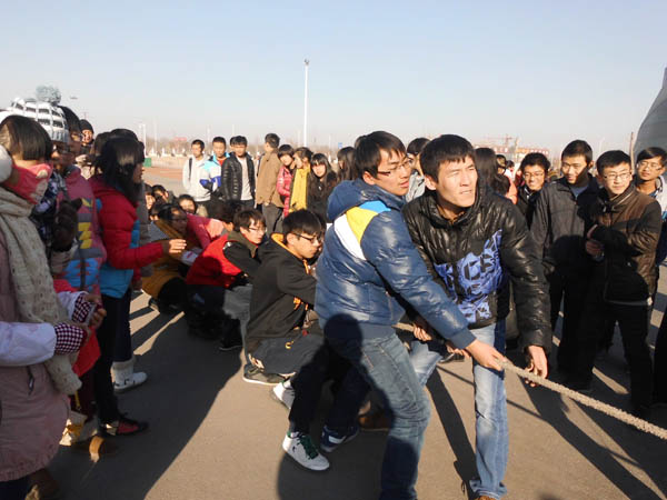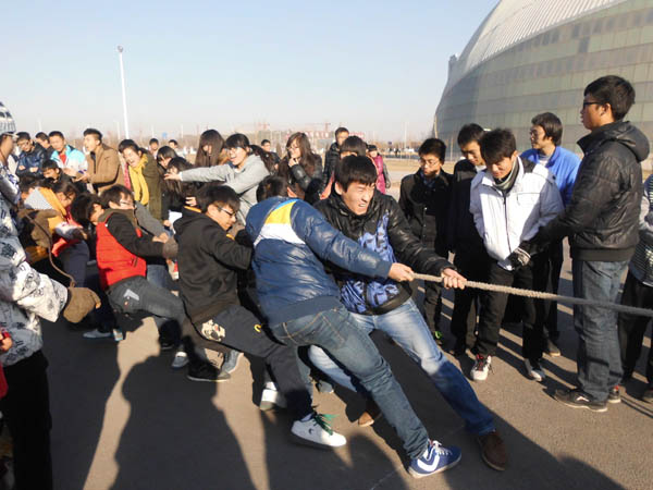 为促进班级间交流、提高团体凝聚力,2013年12月11日下午快乐8 举办迎新生拔河比赛。比赛过程中,气氛异常紧张。各班的啦啦队热情火爆,为参赛同学增添了不少信心。加油声、呐喊声,充斥在校园上空,久久的回荡。即使是寒冬时节,依然没有抹杀学生们的热情,比赛气氛被一次又一次的推向高潮。农水班获得此次比赛的冠军,城规班与建筑班分别荣获亚军、季军。