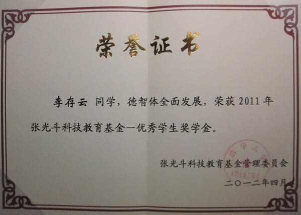 2008级水利水电1班学生李存云获得张光斗科技教育基金优秀学生奖学金,并于2012年4月28日应邀在清华大学新水利馆参加第五届张光斗科技教育基金优秀学生奖学金颁奖典礼。