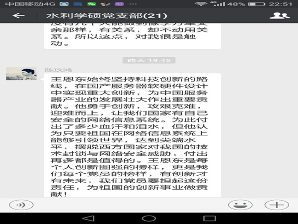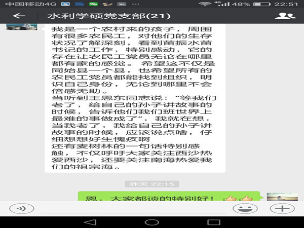 观看结束后,16个党支部的党员对观看完纪录片后的感受进行了深入的交流。大家从自己的经历感想到自己身边的榜样,真诚地谈着自己的感受。兼职辅导员韩东在交谈自己的感受时这样讲到:“不忘初心,忠于坚守”,分享了他对自己身为一名党员的认识、坚守的责任,以及向优秀党员学习的决心。水利学硕研究生党支部的李文证说:“我是一个农村来的孩子,周围有很多农民工,对他们的生存状况了解深刻,看到苗振水苗书记的工作,特别感动,它的存在让农民工党员无论在哪里都有家的感觉。 希望这不仅是同始县一个县,也希望所有的农民工党员都能找到组织,明晰自己身份,无论到哪里都不会倍感无助。”…… 各支部党员充分参与,积极发言,掌声不断。会后,党员们还通过支部微信群继续发表个人感受。