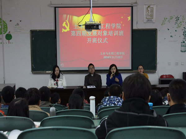 2016年11月23日,第四期党员发展对象培训班开班仪式在宁夏大学文萃校区三阶会议室成功举行,土木与水利工程学院学办主任郭利主持仪式。学院党委副书记柳松洁,团委书记王娜,16级辅导员陶雪梅及第四期发展对象全体成员参加了此次仪式。