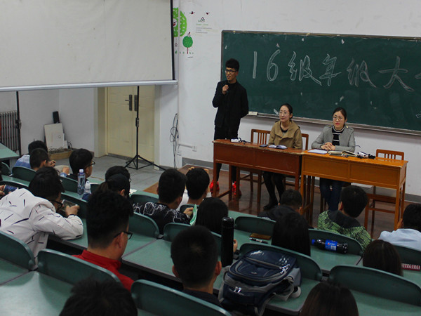 文萃校区工科楼三阶顺利召开,学院党委副书记柳松洁、16级辅导员胡思斯出席此次会议。16级全体学生认真聆听了本次会议内容。