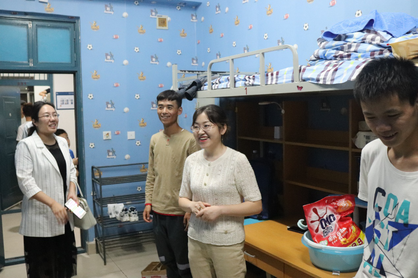 20点30分学院党委副书记柳松洁和19级代理年级主任王娜来到15号楼男生公寓走访新生住宿情况,对19级新生与学长住的混合宿舍进行实地了解。从二楼开始,老师们和小班,班助一起来到男生新生宿舍,柳松洁和王娜对新生是否适应宿舍生活,宿舍卫生风貌如何细心的提问;有家长恰好在宿舍的老师们亲切的嘱咐,让其放心。除此之外,因为是与学长混住,老师们还对提前到校的学长嘱咐是一个专业的要对学弟们传业授道解惑,不是一个专业的也要对学弟在生活上多加照顾,对新生们嘱咐要与学长们和睦相处,不论是宿舍卫生方面还是学习精神方面都要提升,一起进步。