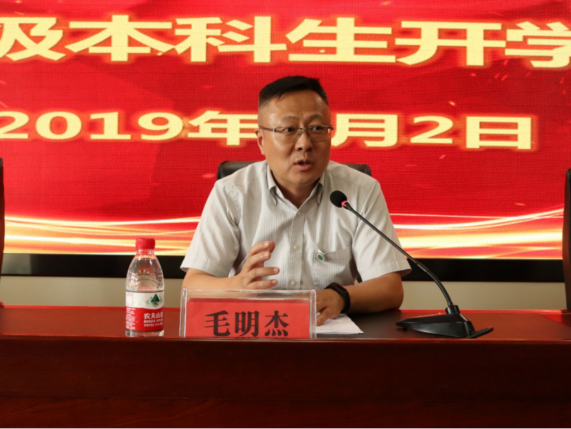 大会最后一项,毛明杰代表学院行政向新生表示热烈欢迎。他为同学们详细介绍了学院的发展成就及未来规划。他还对新生在未来几年的学习生活提出了希望并送上了祝福,他强调多读书,提高学习能力的问题并且要求与社会实际相结合,不要脱离实际。