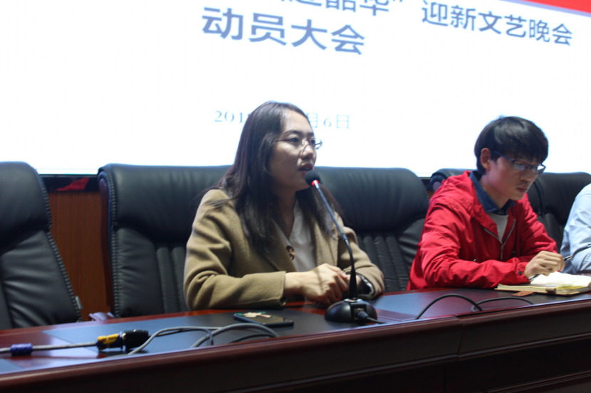 王娜作总结发言,她再次提出了迎新晚会的重要性,学院领导对其高度重视,是最近学院的中心工作之一。她表扬了在场参与人员的自觉性和积极性,鼓励大家,树立信心。她还对近期演员早操、晚自习等工作做了安排。
