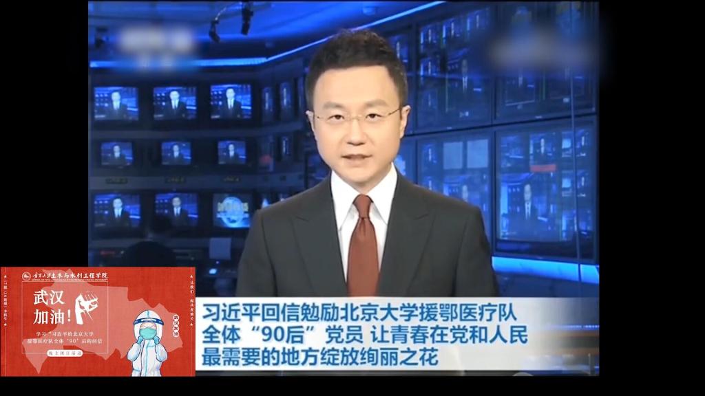 团日活动开始,播放了《习近平给北京大学援鄂医疗队全体’90’后的回信》的新闻联播画面。随后以抗疫日记为主题,选取了“医护人员”“建筑工地”“患者献血”“线上教学”“我们”等5个画面,通过以小见大的形式,为大家展现了战疫一线的感人故事:那一张张面容下的压痕,那一个个与时间赛跑的工地,那一幕幕舍己奉献的画面,还有离我们最近的老师们的第一次线上教学……通过观看直播视频,同学们纷纷在自己班级的QQ群内展开了讨论,接下来让我们看看部
