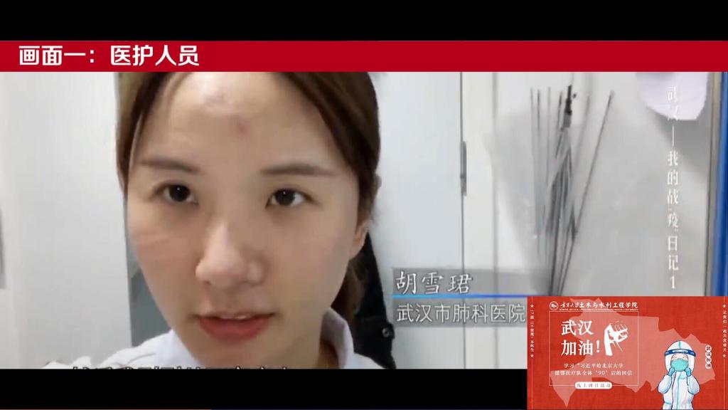 (3)2017级土木二班黄爽:通过视频的观看,我看到90后,00后的担当,青年一代的担当。看到美丽的白衣天使在前线的努力拼搏,无畏生死的英勇精神。看到了不同岗位的人恪尽职守,做国家坚实的后盾,感谢这些人的努力,他们强大的责任感,使命感,正是因为有他们的奉献,才有我们的安定平安!向他们道一句:辛苦了!