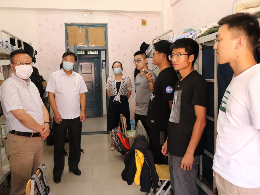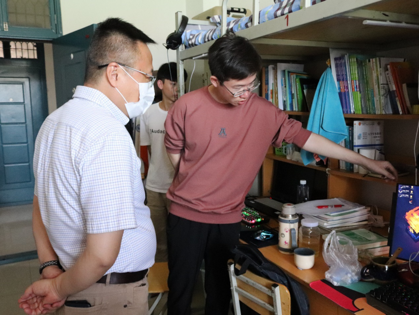 在宿舍楼大厅设立报到处,安排学生进行值班。书记和院长询问了报到处值班人员的具体工作情况,了解学生返校时间。为了更好地了解同学们返校后的生活状态,院长与书记逐个宿舍进行观察慰问,询问学生们的返校方式与身体状况,到校后宿舍情况以及课业问题。
