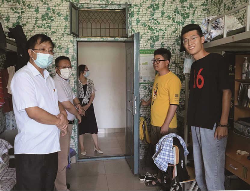 党委书记张晓天、院长毛明杰、学生工作办公室主任王娜于15号楼公寓看望返校学生。