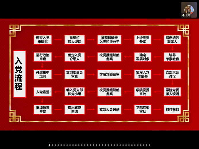按照培训计划,王娜老师为全体学员进行了“党员发展入党流程”授课辅导。王老师从申请入党、入党积极分子的确定和培养教育、发展对象的确定和考察、预备党员的接收、预备党员的教育考察和转正等方面对入党流程进行了规范、详细、具体的介绍。同时,王老师也针对入党过程每一个阶段需要准备的材料和相关要求进行了详细的介绍。通过本次培训,学员们对如何从一名大学生成长为学生党员有了系统的了解和认识,明确了今后努力的方向。