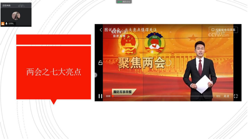 主题团日活动上,各班团支书在线上带领同学们进行了两会精神的学习,学习了今年全国两会关于“新冠肺炎疫情防控”、“今年经济社会发展目标”、“打赢脱贫攻坚战”等八大看点;随后带领同学们了解了全国两会各大热点议题,并就热点展开了热烈讨论。活动最后,参加活动的同学们纷纷表示,作为大学生虽然不能去亲身到两会现场,但我们仍然要积极学习两会精神,了解国际国内形势,明辨是非、认清大局、坚定立场。坚决拥护党中央和国家所做出的各项科学决策。