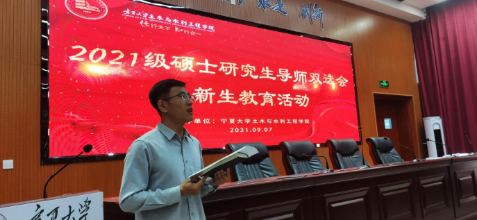 会议第一项,2021级硕士研究生导师双选会由土水学院副院长刘海峰主持,学院多位导师出席会议。导师们依次向全体研究生新生介绍了自己的研究方向和学术要求,鼓励同学们多与老师交流、选择适合自己的导师和研究方向。