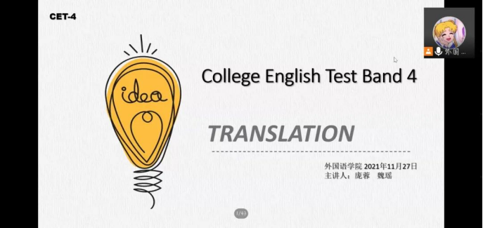 紧接上次外国语学院的学长学姐们对英语四六级听力阅读等的讲解,本次英语四六级线上辅导答疑活动主要对翻译和写作部分进行了补充和讲解,使同学们能够更加完善地掌握英语四六级试题,熟悉英语考试中各部分的得分点和注意事项,在四六级考试的时候更加有把握。