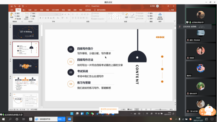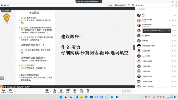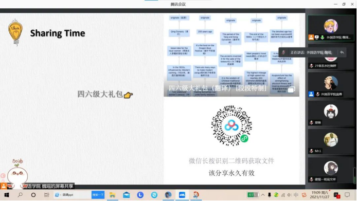 为了方便讲课的学长学姐们和同学们,本次英语四六级辅导答疑活动仍然借助腾讯会议的方式由外国语学院的学长学姐为同学们进行讲解,活动时间为11月28日下午15:00-17:00、19:00-21:00。活动前由学风建设部联络外国语学院的学长学姐,对同学们进行线上辅导。同学们都积极参与本次活动,在活动开始前五分钟就已根据指定腾讯会议号到达指定会议,之后学风建设部对报名同学进行考勤。