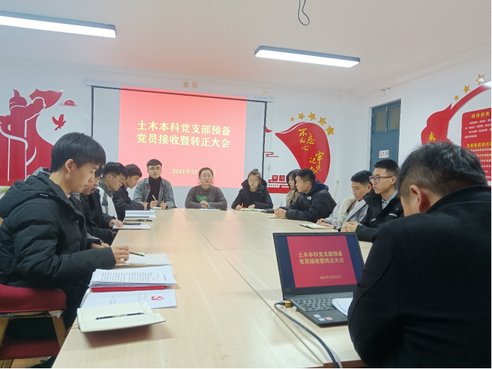 土木本科党支部于党员活动室召开党员大会,讨论接收下半年预备党员接收暨转正大会。支部书记何涛主持会议,支部全体党员参加会议。