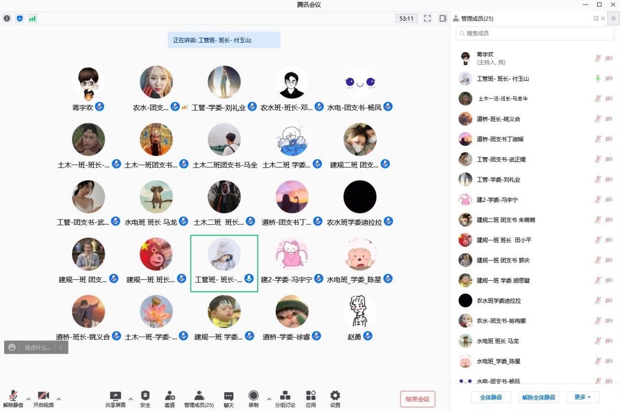 1月27日下午,本科生2021级在腾讯会议召开2021年秋季学期学风建设总结会,各班级班长、团支书、学习委员参加会议,会议由年级主任蒋宇欢主持。