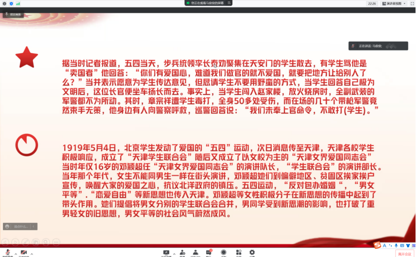 活动前期,各团支部积极筹备活动内容,希望通过丰富的活动形式让同学们积极参与本次线上团日活动,例如观看相关视频,组织答题活动,进行主题宣讲等。活动过程中,通过录制微团课演讲视频、同学们分享自己心中的英雄事迹等活动形式让大家更深入的学习团史,树立正确的历史观,让红色基因薪火相传。活动最后,各团支部就本次团日活动进行总结,向广大青年团员发出号召,树立正确的历史观、国家观、文化观,展现其独特的价值和意义。立足新时代,展现新作为,时代的接力棒在我们手中交接,我们是祖国恢复、发展、飞跃必不可少的一份子,我们理应挺起青春奋斗的钢铁脊梁,并为之奋斗。