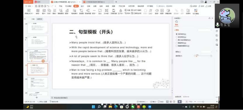 在写作部分,主要介绍了英语四六级考试中对于写作部分的时间分配,以及写作的一些技巧,比如词汇替换、连接词的应用,同时还分享了一些万能句型模板和提高写作水平的方法。在翻译部分,主要讲解了一些翻译会考到的话题以及其表达形式,最后,还讲解了做英语四六级翻译的步骤。