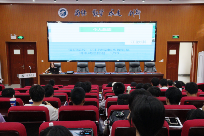于知行楼三楼阶梯教室开展考研保研经验分享会。本次分享会邀请到2018级交管系王杰、张万龙,2018级土木系李紫荆、李斌、罗永,2018级水利系郑小雨,2017级建规系江歆琪、李艳、张天然、李昱甫,为大家介绍保研和考研的相关经验。