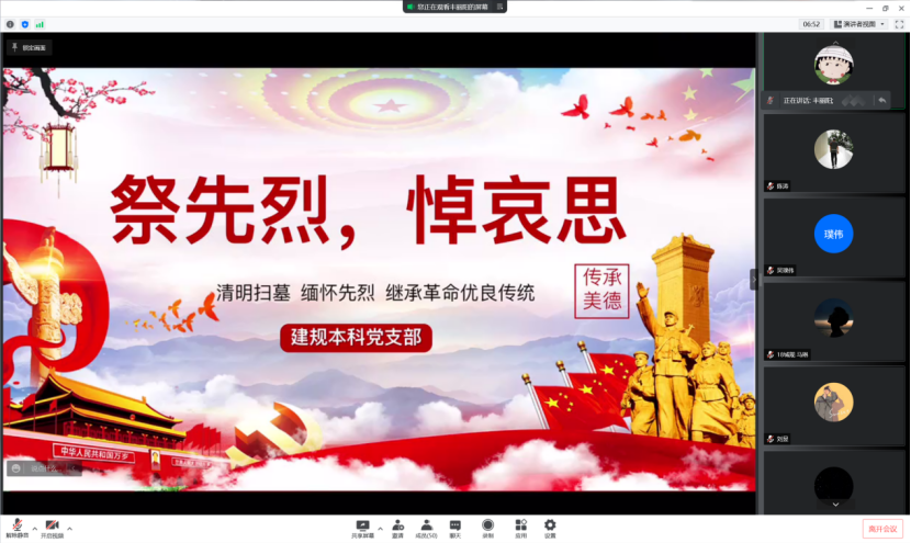 建规本科党支部于线上开展了2022年第5次党专题组织学习会暨“祭先烈,悼哀思”活动,通过英烈故事云分享会、观看纪录视频等形式,让大家在慎终追远中不忘初心、担当使命,进一步坚定理想信念,弘扬英烈精神。建规本科党支部集体参与会议,会议由组织委员丰丽阳主持。