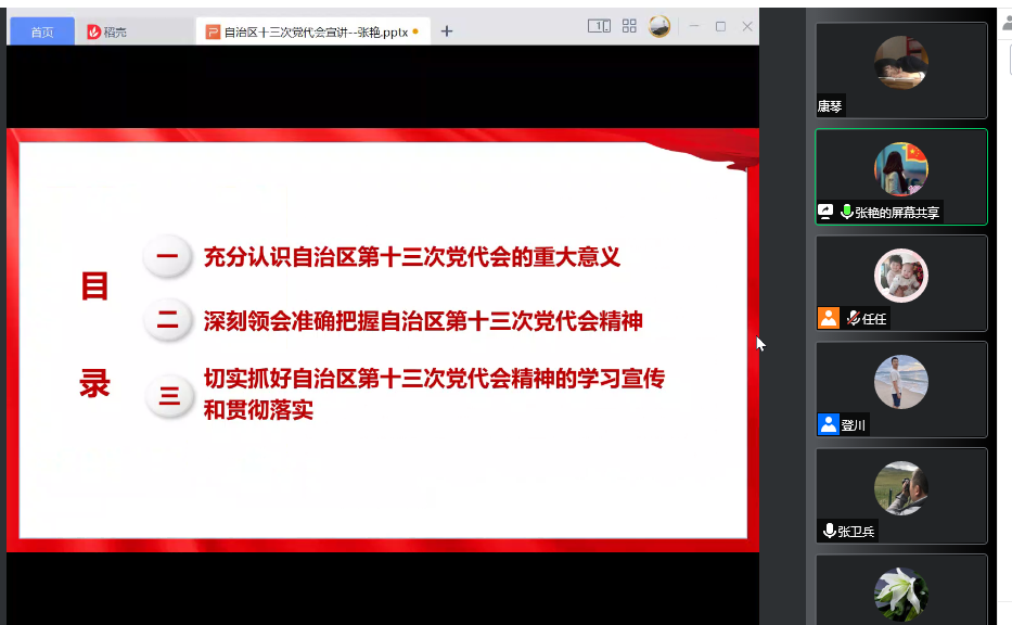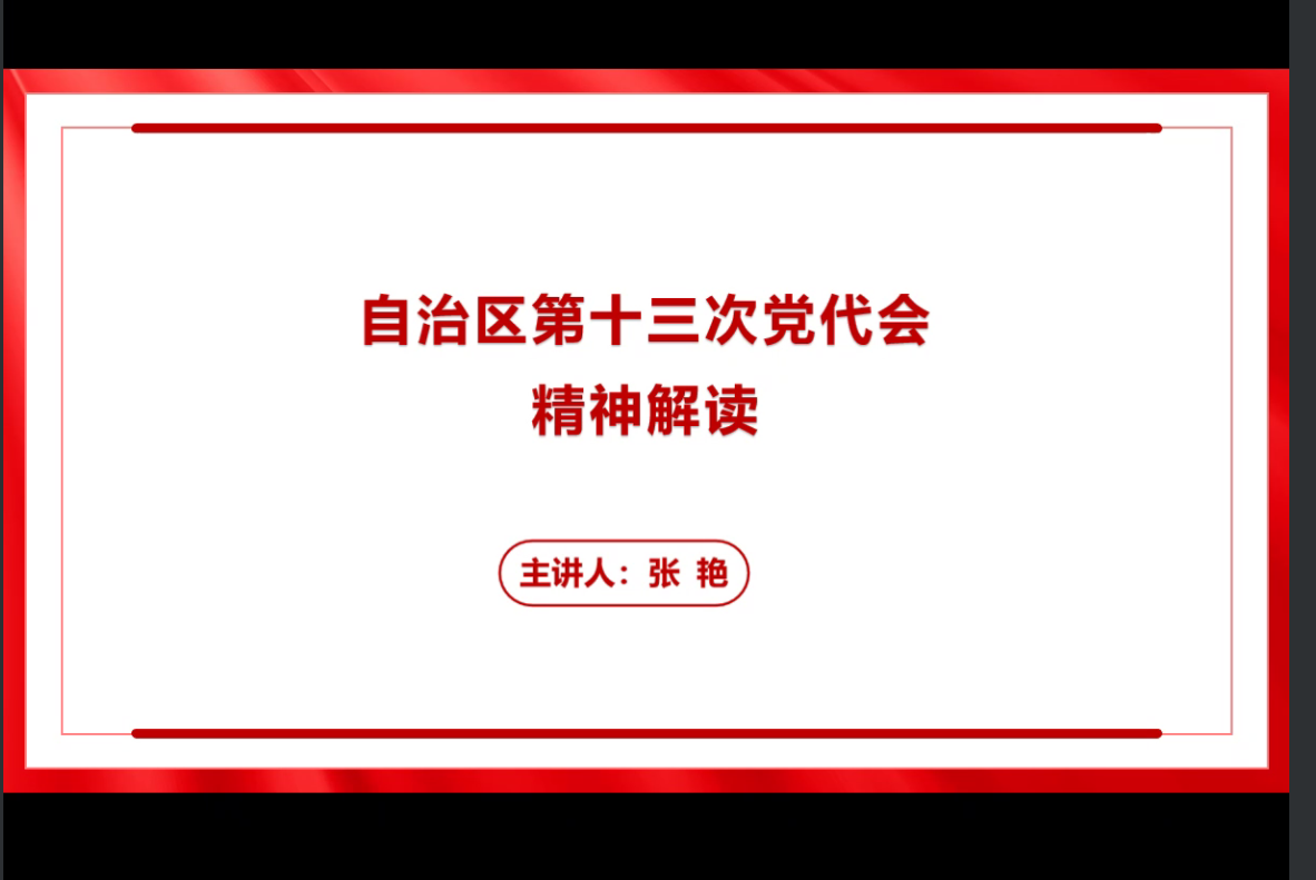 张艳围绕“充分认识自治区第十三次党代会的重大意义”“深刻领会准确把握自治区第十三次党代会精神”“切实抓好自治区第十三次党代会精神的学习宣传和贯彻落实”三方面内容进行了深刻解读。