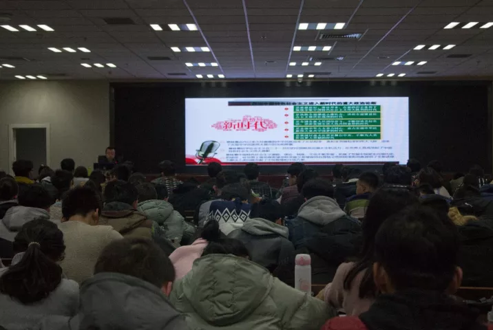 党锐锋老师通俗易懂、声情并茂地为同学们解读了中国共产党第十九次全国代表大会整体流程及习近平总书记党的十九大报告内容,他利用图片组与音视频结合的方式详细阐明了大会报告的形成过程,从大会的主题,大会的盛况,大会的主要成果三个方面展开了详细介绍。他还阐述了有关全方位外交布局深入展开的内容,使同学们对“推动构建人类命运共同体,书写中国特色大国外交新篇章”有了更进一步的认识。接下来他综述了党的十八大以来全面从严治党的成就,并且概述了中国特色社会主义进入新时代的重大政治论断。宣讲活动最后,党老师提议所有同学齐颂毛泽东同志的著名诗词《沁园春•雪》,让同学们在激情的朗诵中再一次体会身为新时代中国人的自豪感。