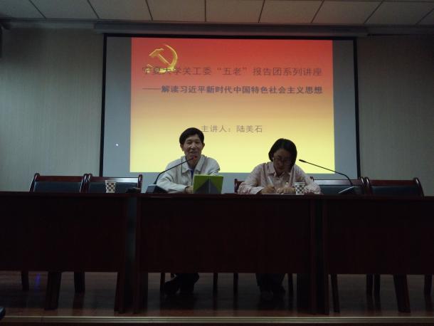 在知行楼5楼会议室举办第七期发展对象培训班首场报告,报告由“五老”报告团成员陆美石老师主讲,题目为《解读习近平新时代中国特色社会主义思想》。本期全体发展对象聆听了此次报告。